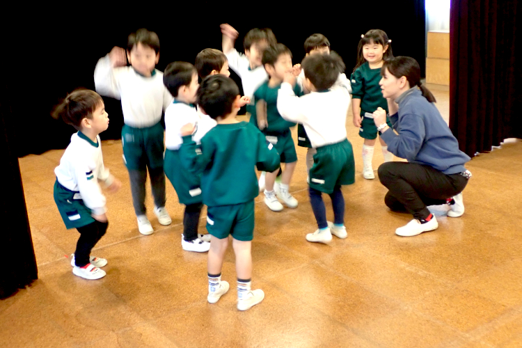 話を聞いてみる「身体表現」では、保育者が出したお題に対して子ども一人ひとりが自分なりの発想で体を動かします。年齢が上がるとグループで表現する遊びも増え、表現の幅を広げます。