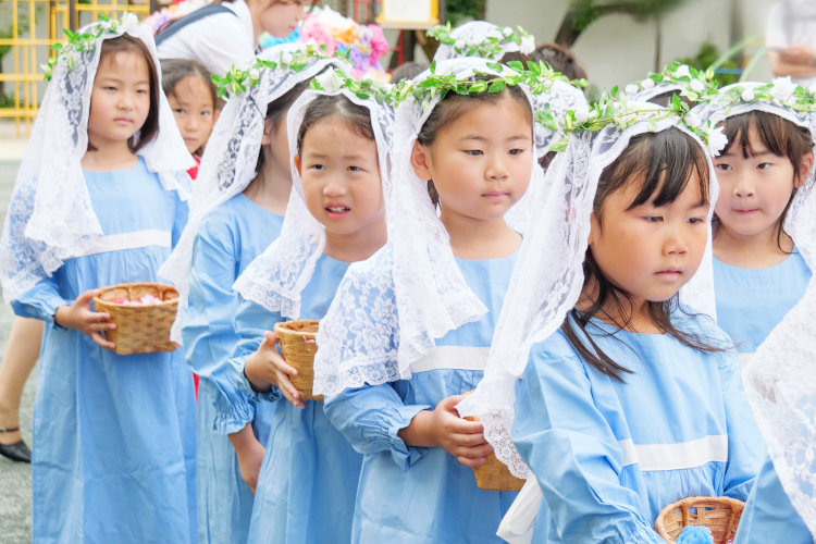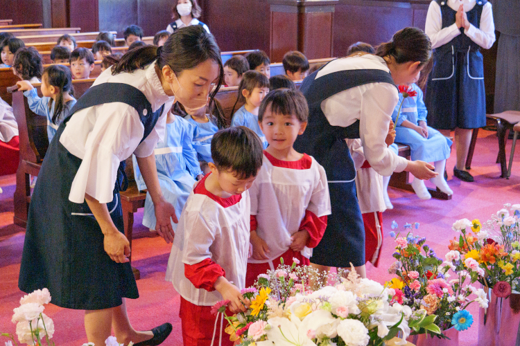 5月のマリア祭では、子どもたちが聖歌を歌い、生花をささげながら感謝の心を育みます。いつも見守ってくださる神様を顧みる習慣や思いやりの心も育てています。
