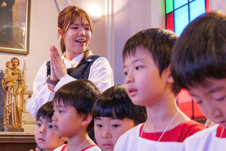 話を聞いてみる5月のマリア祭では、子どもたちが聖歌を歌い、生花をささげながら感謝の心を育みます。いつも見守ってくださる神様を顧みる習慣や思いやりの心も育てています。