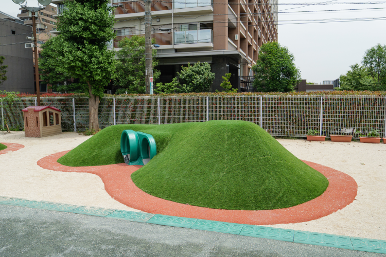 園庭では自由遊びを通じて主体性や社会性、表現力を育成。ビルが周りに立ち並ぶ環境でも、自然にも触れながら、仲間と共に心と体を健やかに育てます。