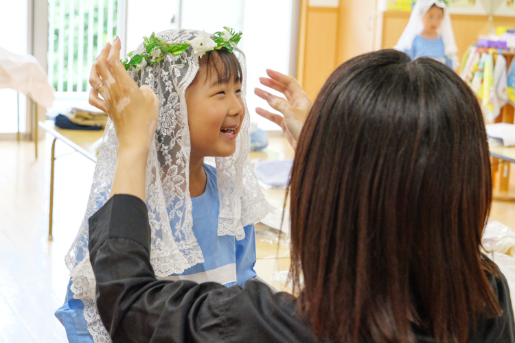子どもたちの自由な遊びの中でも、イエス様やマリア様に見守られていることを感じられるような、心の教育を大切にしています。お友だちとけんかや言い合いをしたときこそ、「許す心」を育む大切な機会。特別な行事のときだけでなく、毎日の園生活を楽しく過ごしてもらいたいというのがわたしたちの願いです。子どもたちに温かい言葉で気持ちを伝え、「みんなに愛されているんだよ」ということを実感できるよう心がけています。