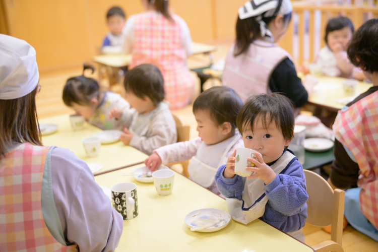 お昼寝から覚めたら、みんな大好きおやつの時間! 「おいしいね」と顔を見合わせる、ほっと一息つく幸せなひとときです。