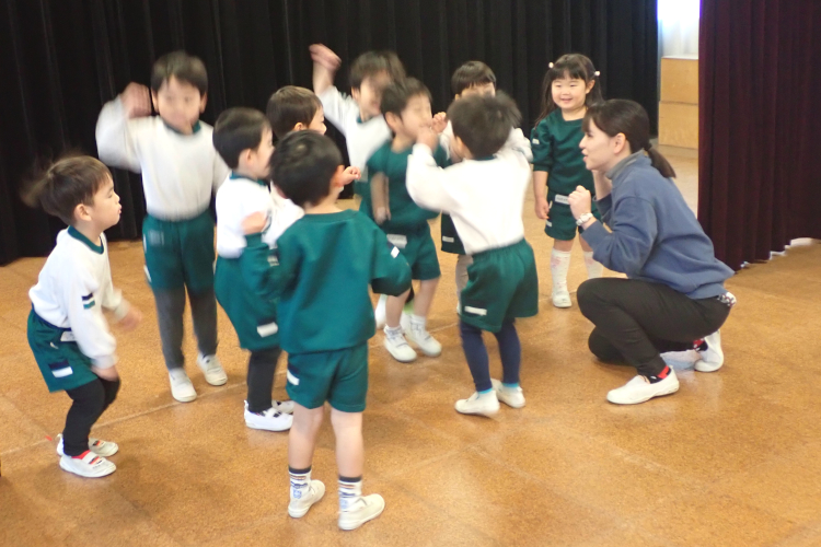 「身体表現」では、保育者が出したお題に対して子ども一人ひとりが自分なりの発想で体を動かします。年齢が上がるとグループで表現する遊びも増え、表現の幅を広げます。